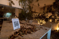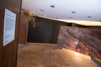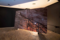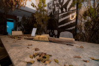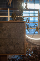 La placa de cuarsita exótica cosmopolitan de @ctkc.stonecenter se integra a la exposición Pueblo fantasma como una pieza más. Y todo bajo la luz maravillosa de @angeloiluminacion
